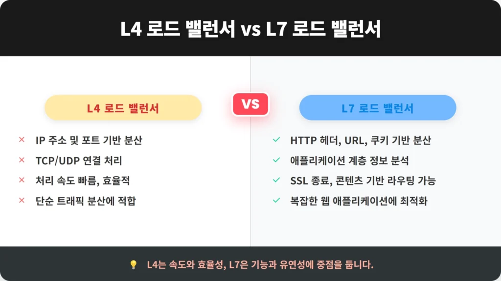 로드 밸런서는 트래픽을 분산하는 방식에 따라 크게 L4와 L7 로드 밸런서로 구분됩니다. 이들은 OSI 7계층 모델의 다른 계층에서 동작하며 각각의 장단점을 가집니다.
