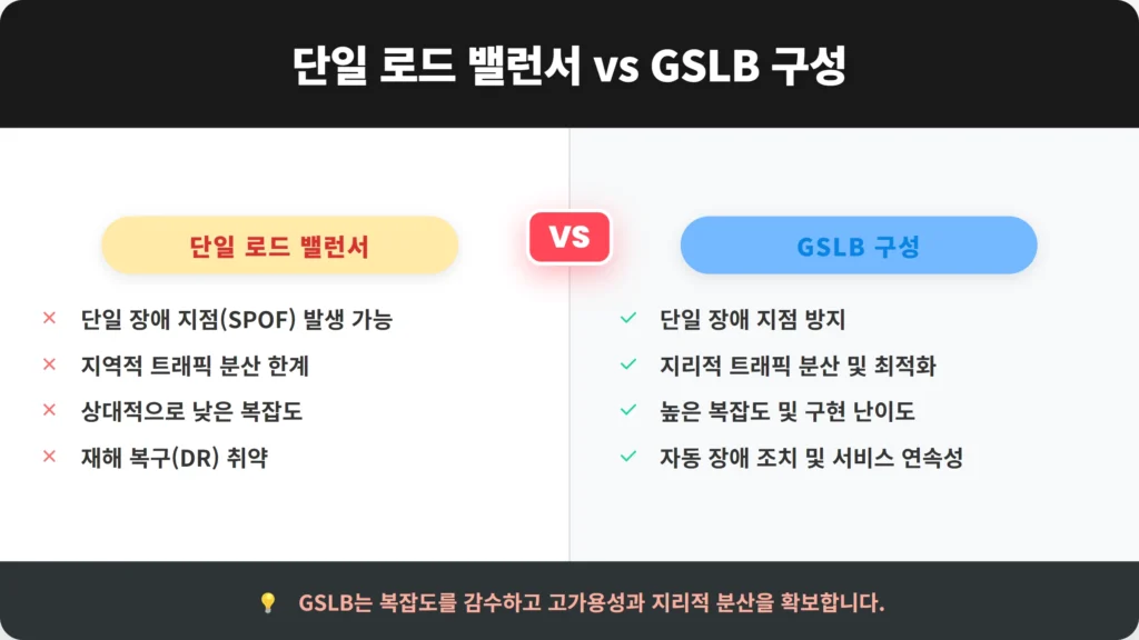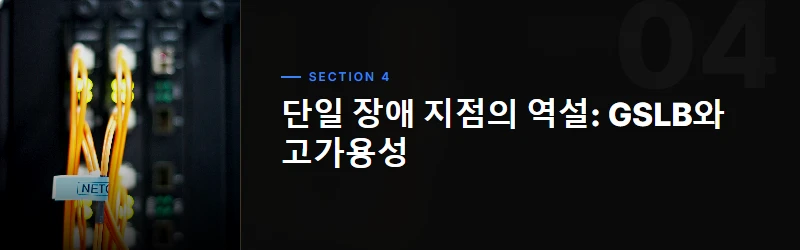 이를 방지하기 위해 GSLB(Global Server Load Balancing)나 고가용성(High Availability) 구성이 필수적입니다. GSLB는 여러 지리적 위치에 분산된 데이터 센터 전반에서 트래픽 부하를 분산하는 기술입니다.