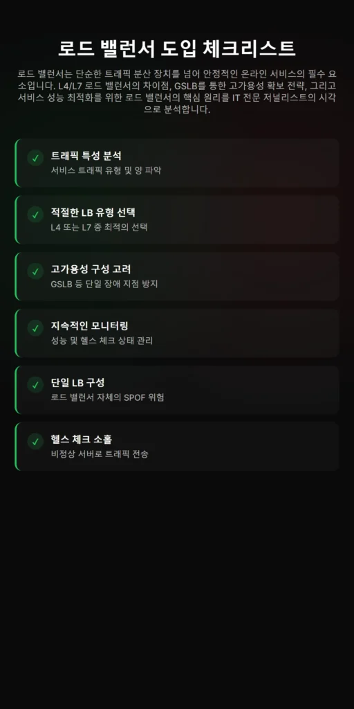 - 고가용성 설계: 로드 밸런서 자체의 단일 장애 지점 가능성을 인지하고, GSLB와 같은 고가용성 구성을 통해 서비스 연속성을 확보해야 합니다.