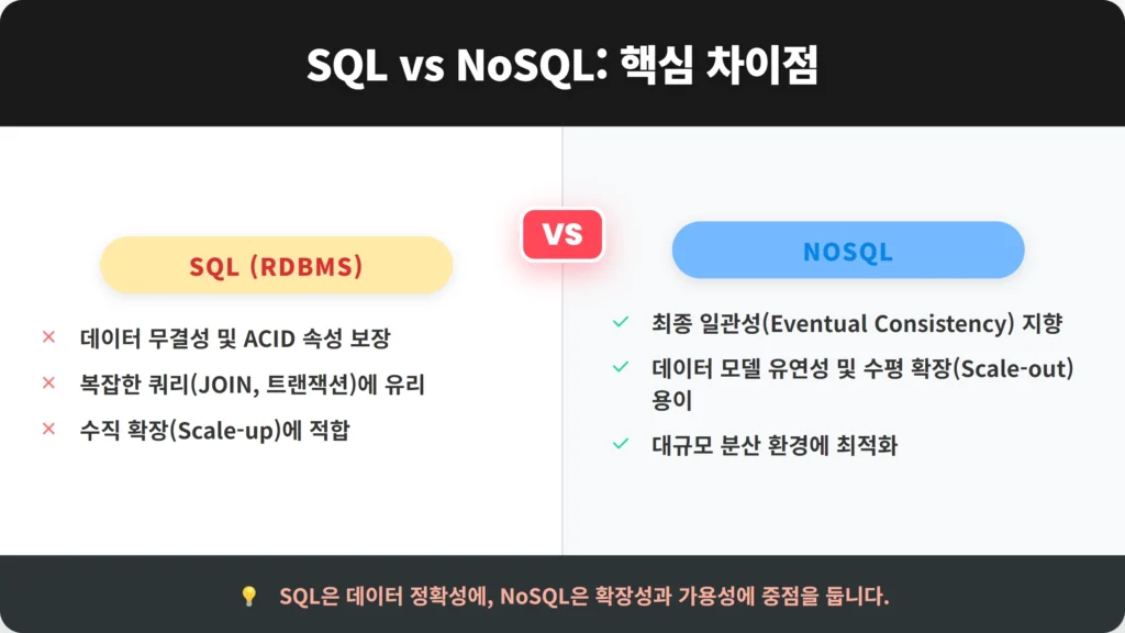 2008년, 구글의 ‘Bigtable’과 아마존의 ‘Dynamo’가 공개되면서 NoSQL(Not Only SQL) 시대의 전조가 나타났습니다. 이들 시스템은 기존 RDBMS의 ACID(원자성, 일관성, 고립성, 지속성) 특성보다 확장성과 가용성을 우선시하는 접근 방식을 선보였습니다.