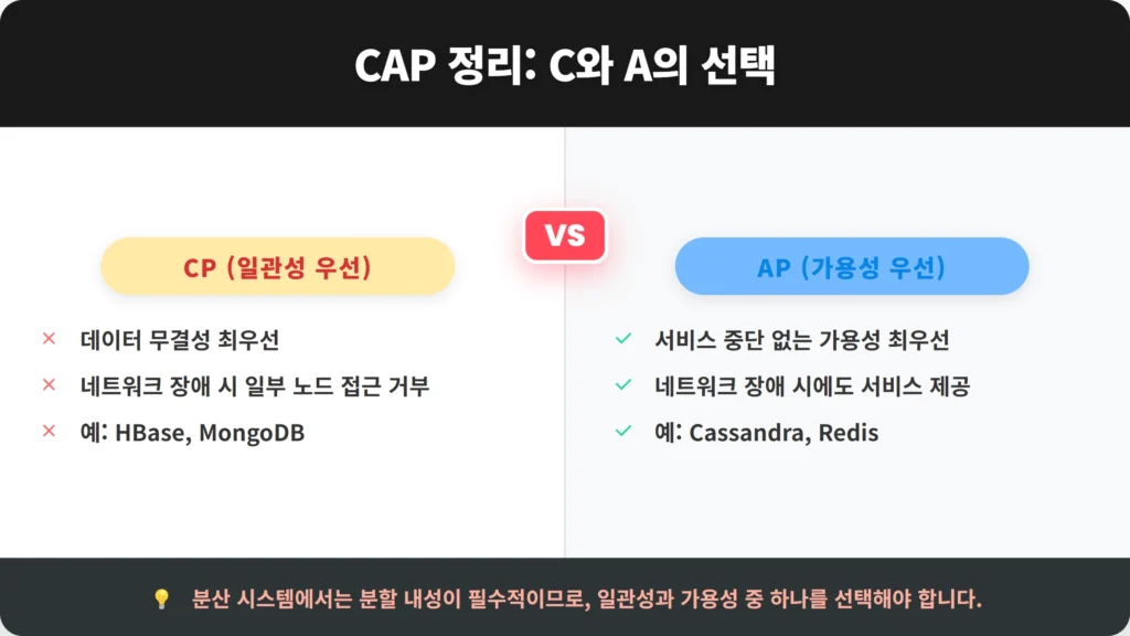 CAP 정리는 분산 데이터베이스에서 일관성(Consistency), 가용성(Availability), 분할 내성(Partition Tolerance) 중 최대 두 가지만 동시에 만족시킬 수 있다는 이론입니다. 분산 시스템에서는 네트워크 분할(Network Partition, 노드 간 통신 두절)이 필연적으로 발생하므로, C(일관성)와 A(가용성) 중 하나를 선택해야 합니다.