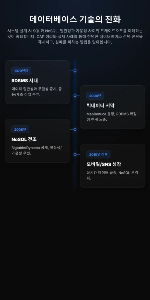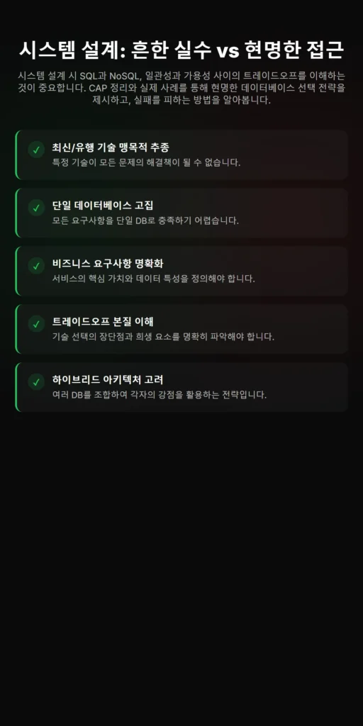 시스템 설계 시 SQL과 NoSQL, 일관성과 가용성 사이의 트레이드오프를 이해하는 것이 중요합니다. CAP 정리와 실제 사례를 통해 현명한 데이터베이스 선택 전략을 제시하고, 실패를 피하는 방법을 알아봅니다.