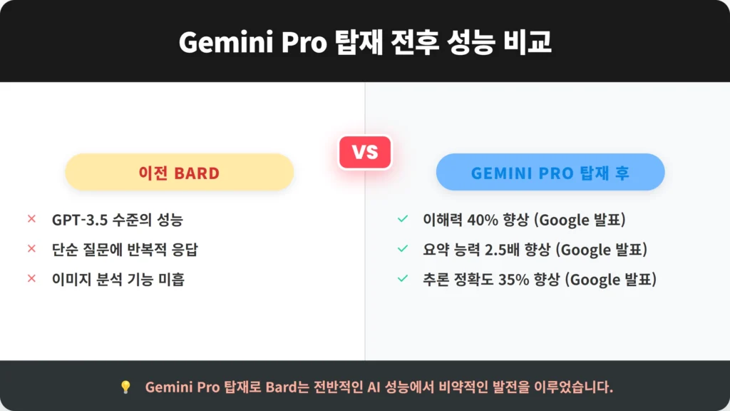 Gemini Pro가 탑재된 이후 Gemini(구 Bard)의 성능은 괄목할 만한 발전을 이루었습니다. Google의 초기 발표에 따르면, 이해력은 40% 향상되어 복잡한 명령어도 정확하게 인식합니다. 요약 능력은 2.5배 향상되어 긴 문서의 핵심을 빠르게 파악할 수 있습니다. 또한, 추론 정확도는 35% 향상되어 GPT-4와 유사한 수준의 정교함을 보입니다.
