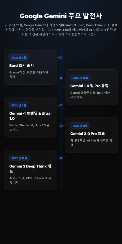 2025년 12월, Google Gemini의 최신 모델(Gemini 3.0 Pro, Deep Think)이 AI 검색 시장에 미치는 영향을 분석합니다. Gemini Pro의 성능 향상과 AI 시대 SEO 전략 변화를 IT 전문 저널리스트의 시각으로 심층적으로 다룹니다.