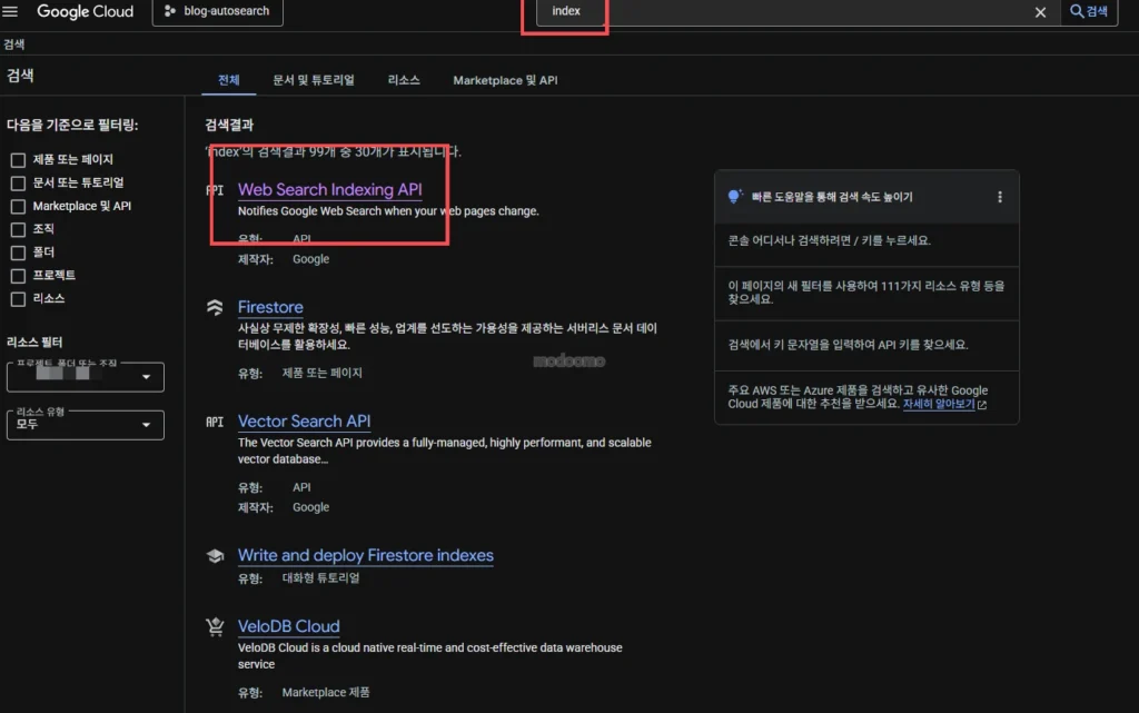 - 검색 결과에서 “Web Search Indexing API”를 선택합니다.