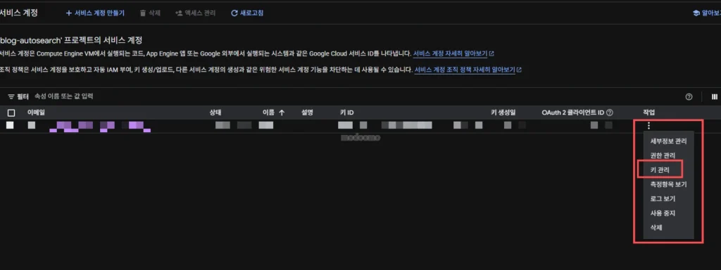 - 생성된 서비스 계정 목록에서 방금 만든 계정을 클릭합니다.