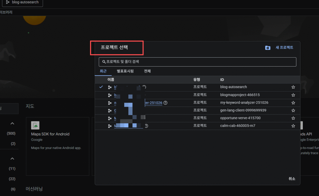 - 상단의 “프로젝트 선택” 드롭다운을 클릭합니다.